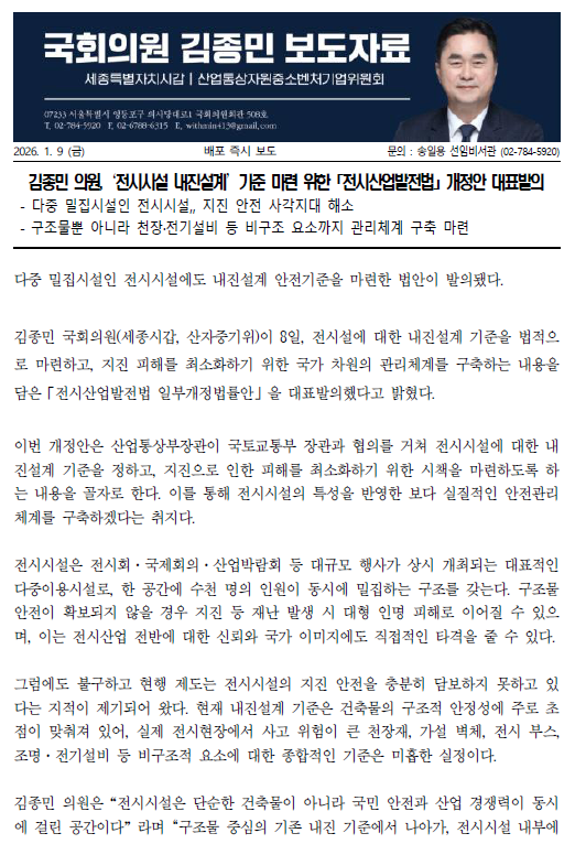 (국회) '전시시설 내진설계' 기준 마련 위한「전시산업발전법」개정안 대표발의